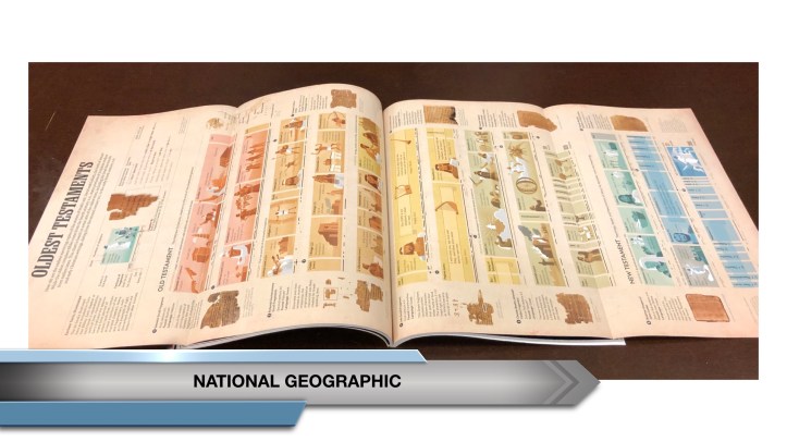 You can sometimes find magazines with foldouts. While browsing at Barnes and Nobles today, I found a knitting magazine with a multi-page foldout pattern, a yoga magazine with postcards pasted in one section and the issue of National Geographic pictured below.