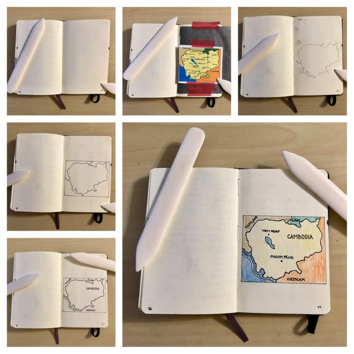 I realized during the inking process that I forgot to trace Tonle Sap Lake in the center of Cambodia and the river that flows in from Laos. I made a couple of measurements with a ruler and drew the lake free-hand.