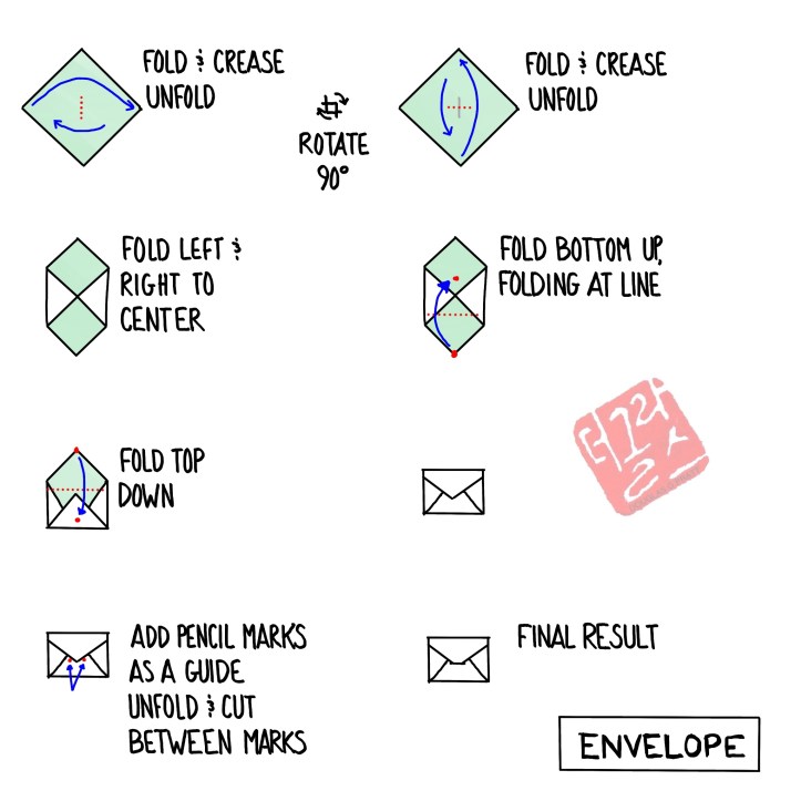 Originally designed to serve as an envelope for sending a letter, this folded envelope is handy for storing small items such as coupons, receipts and photos. Below are pictures of the envelopes I pasted into my notebook. For the 3.5-inch wide notebook, a starting size of 4.5-inches (square) works well. If you oriented the envelope as tall instead of wide you could have a larger envelope.
