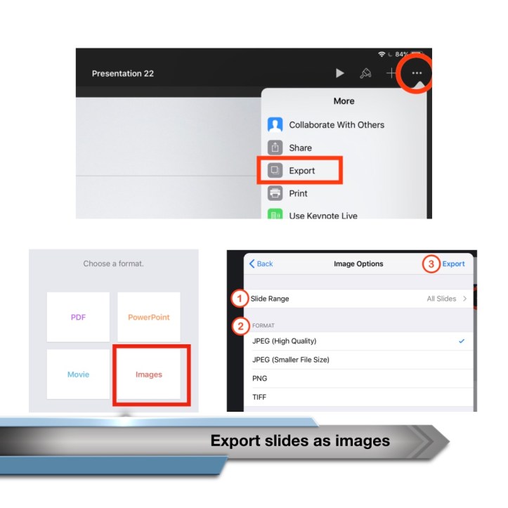 After completing your slide deck you will want to download the slides as images. As before, click on the ellipses (…) and select Export. Choose Images. Select the desired slides to export, pick a format and click Export. You will see a prompt on where to send your images. I usually choose to download to the camera roll.