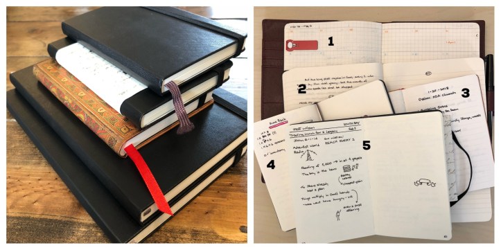L-R: (1) Sermon sketchnotes, (2) Music journals, (3) Planners, (4) Bible notebooks, and (5) daily notes in pocket notebooks.