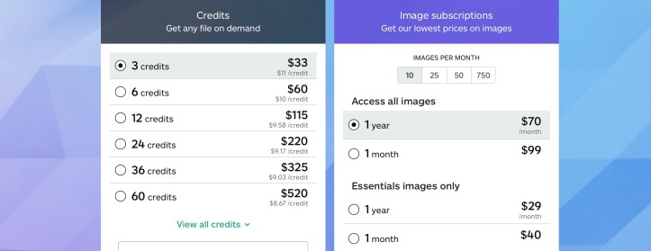 Buying images from iStockPhoto can be accomplished by purchasing credits which can be used for images. While most of the photos are three credits, it is possible purchase only one credit. The price per credit is discounted when buying multiple credits. Alternatively, you can subscribe to download a selected number of images monthly. I don’t use enough images to make this option beneficial.