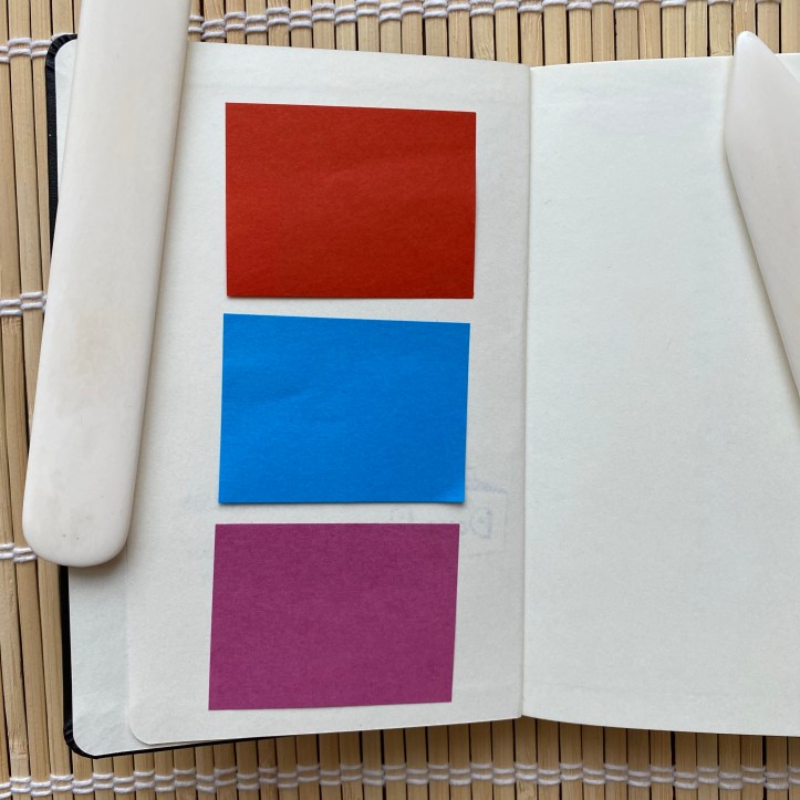 At the beginning and end of the notebook I add a few small self-adhesive notes. These are useful as bookmarks and as a way to leave a note for someone else.