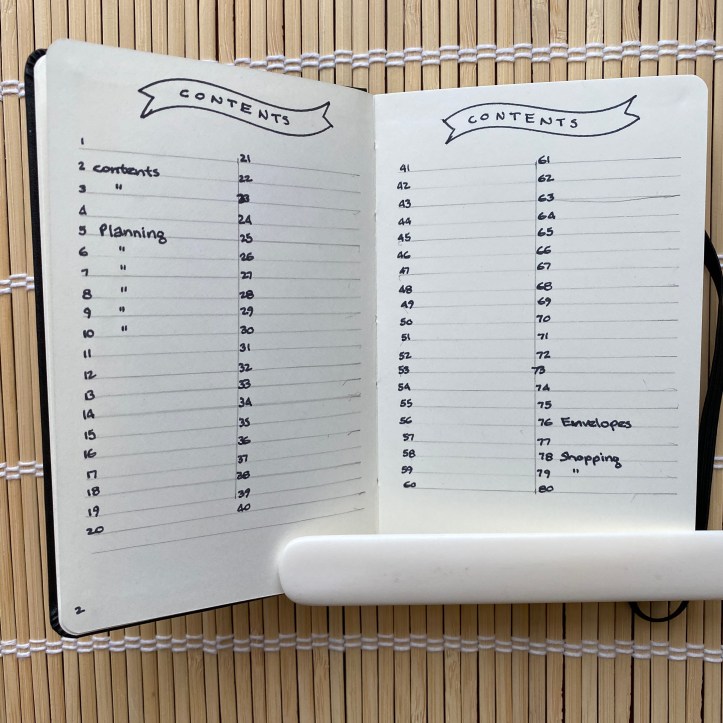 Since the small Moleskine Art notebooks have 80 pages, I create a 2-column by 20-row table on two adjacent pages, for a total of 80 spaces. I number these to create a table of contents. As I enter content on a page, I write a one-two word description in the table of contents. This is helpful while I am actively using the book as well as when I need to look for digitized information later.