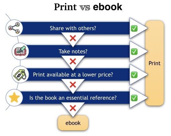 To help me decide on whether to purchase print books or ebooks, I use the following criteria, displayed here as a flow chart.