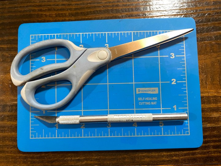 CUTTING TOOLS – I use three cutting tools regularly. Scissors are useful for cutting small details or when something needs to be trimmed quickly. I also have a small cutting mat and a precision cutting tool (X-acto knife or generic brand ([e.g., Hobby Lobby]).