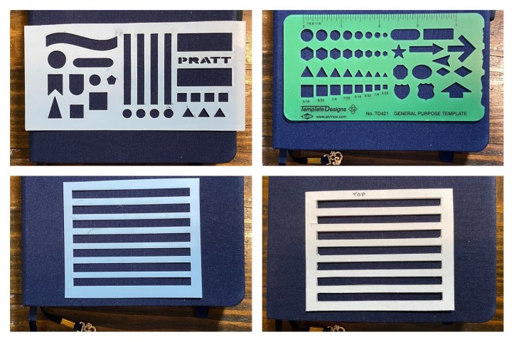 Templates. In the picture below are four templates. The upper left is a template that I designed and my dad cut on his laser engraver. Since this may not be an option for everyone, you can also purchase ready-made templates from an art supply store. The green Alvin template (upper right) cost about $7.00 and fits in the back pocket of a 5.5×3.5 inch notebook (pocket Moleskine). The lower images are different versions of the same template – a set of guides for lines. I first design and constructed the template from card stock (right) but then had it cut commercially (left) as part of a set of templates.