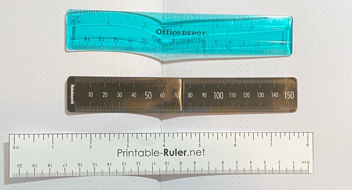 Rulers. Keeping a ruler nearby on your desk is convenient, and for this purpose I keep a plastic 6-inch rule in a pencil case. I also discovered a bookmark ruler that magnetically fastens to a page. Unfolded, it is 15cm (about 6 inches). From time to time it may be handy to print a rule. The printed ruler pictured below is from Printable-Ruler.net. A 12-inch (30cm) printed ruler can easily be folded and stored in the back pocket.