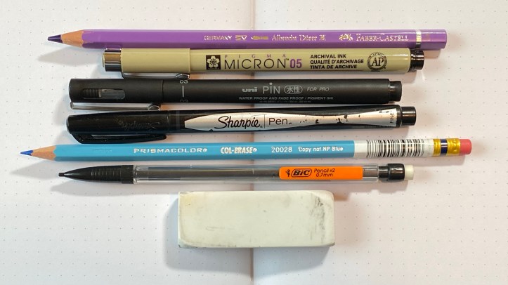 Writing Utensils. These pens and pencils (and an eraser) represent the many pens and pencils I have available to use. I selected these because this is the minimum set of writing tools: tool for coloring (pencil, pen, marker), fine liner for black lines, a light blue pencil for creating guidelines and a standard #2 pencil. The erasers on mechanical pencils don’t erase cleanly for me, so I keep a large eraser nearby.