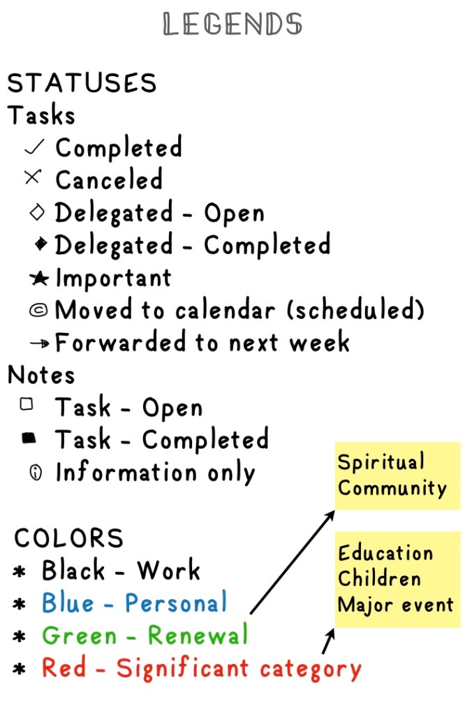 Add both the colors and statuses legends to a page near the front for quick reference. You can also add to the inside front cover (as indicated in the image above from the zine).