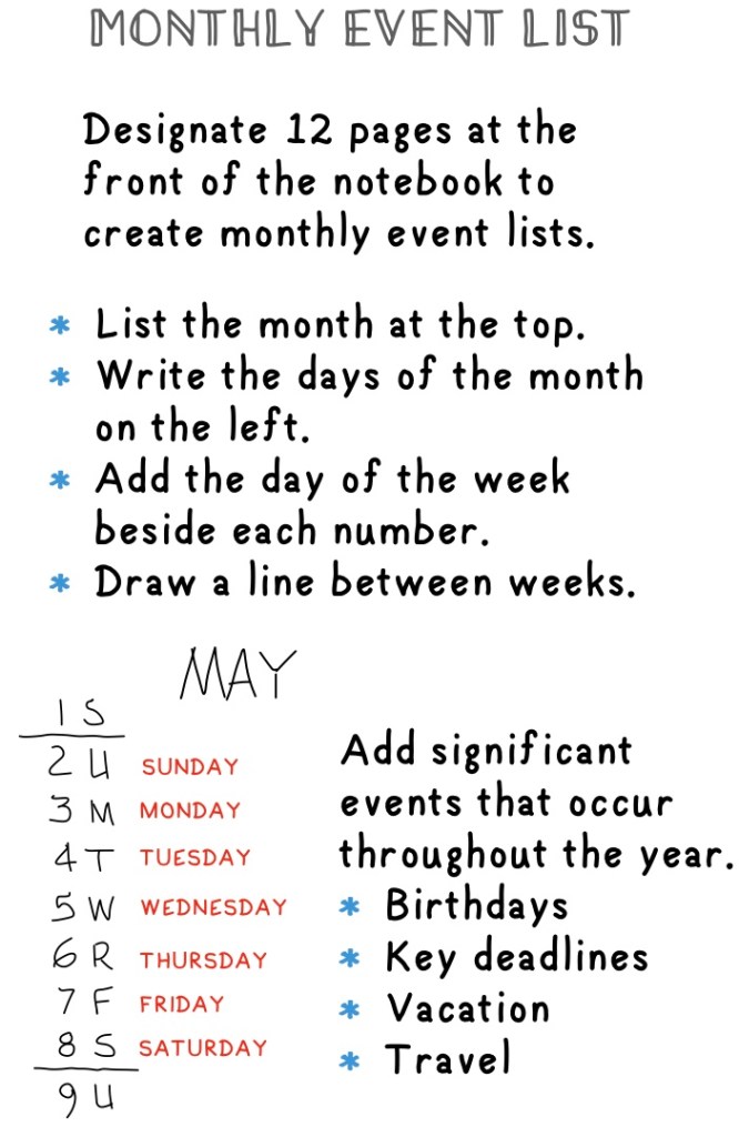 Create twelve monthly event lists. I prefer the list to the standard calendar view. It’s easier to draw and allows more room for events.