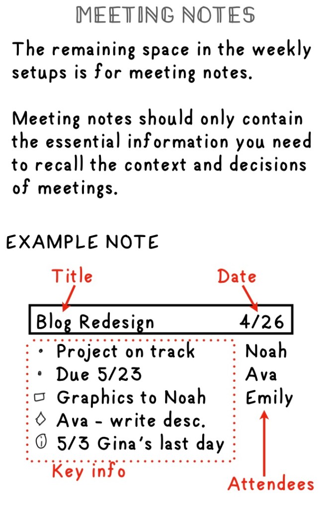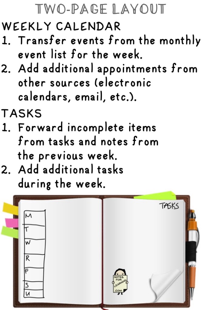 The bulk of your planner will consist of two-page layouts. The primary elements on these spreads are the week’s events, tasks and notes. Most of the space on the two pages of each week will likely be filled with notes.