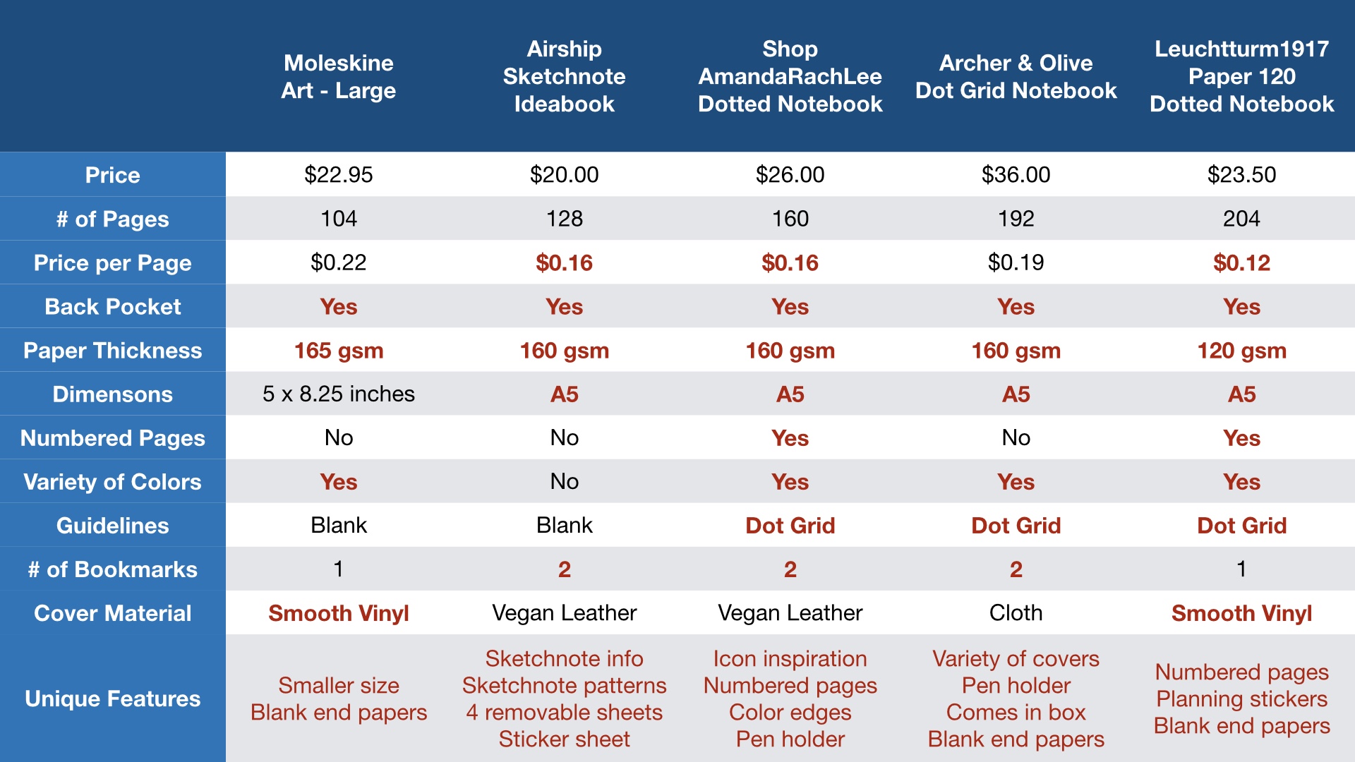 The top three had scores of 12, 11 and 10. As a planning notebook, the notebooks by Shop AmandaRachLee and Leuchtturm1917 were the winners. While it may be a stretch to use the Moleskine and Sketchnote Idea Book for planning, they are excellent for their true purposes – sketching and sketchnotes. The Archer & Olive worked well for me this year, but placed third in this evaluation.