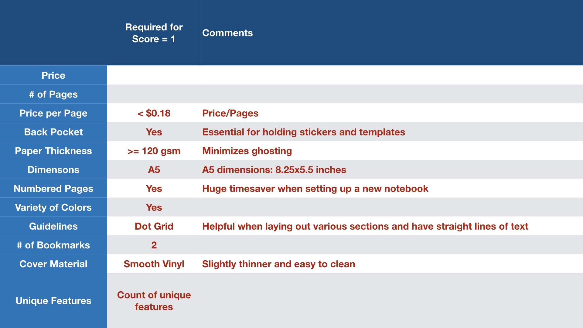 To help me evaluate the notebooks I created a basic scoring system with different elements. Each preferred element earned a score of 1. This particular scale is specifically for preferences. For example, I like thicker paper and smooth covers.