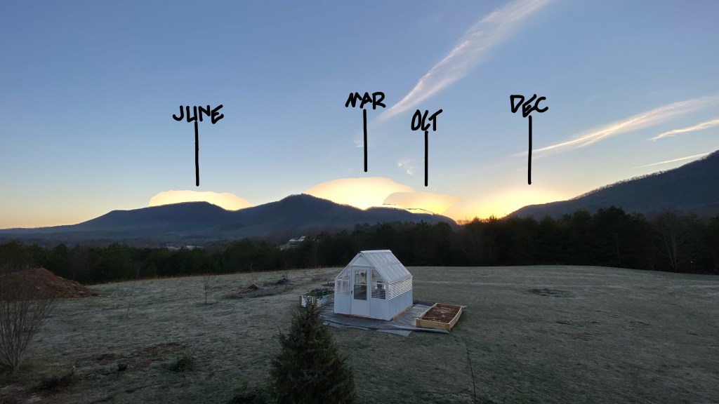 Something else I found interesting was the movement of the sun. In the video, around mid-June, you’ll notice that I zoomed out to capture more of the mountains. Below is an edited image with the location of the sun in March, June, October, and December. These are days closest to when the seasons changed and the sky was clear.