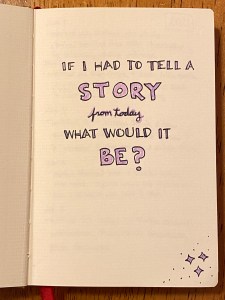 In Storyworthy, Matthew Dicks wrote about his experience noting daily at least one incident that occurred. The prompt he suggested is, “If I had to tell a story about today, what would it be?”