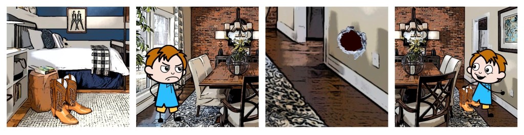 ANIMATED KEYNOTE. Rather than just keeping video of me talking to the camera, I decided to add some variety. For the story, when my brother kicked a hole in the wall and blamed me, I created a simple, animated Keynote and used screen capture to record it as a video. Below are the scenes (slides) I created using backgrounds, a character, and a hole (transparent png).