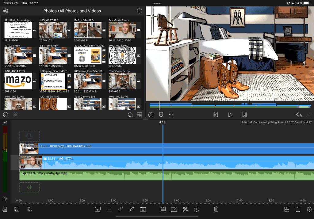 I had already consolidated the four short videos using the LumaFusion video editing app on my iPad for Rachel, and to this I added the scenes described above, a few captions, and a music track.