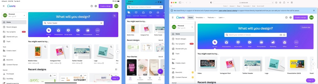 Canva is available online from a desktop or laptop computer, and accessed through apps on tablets and phones. I accomplish about 90% of my writing, design, planning, and other activities via my iPad, so it is my go-to for Canva as well. However, I find it convenient to use both my laptop and phone from time to time.