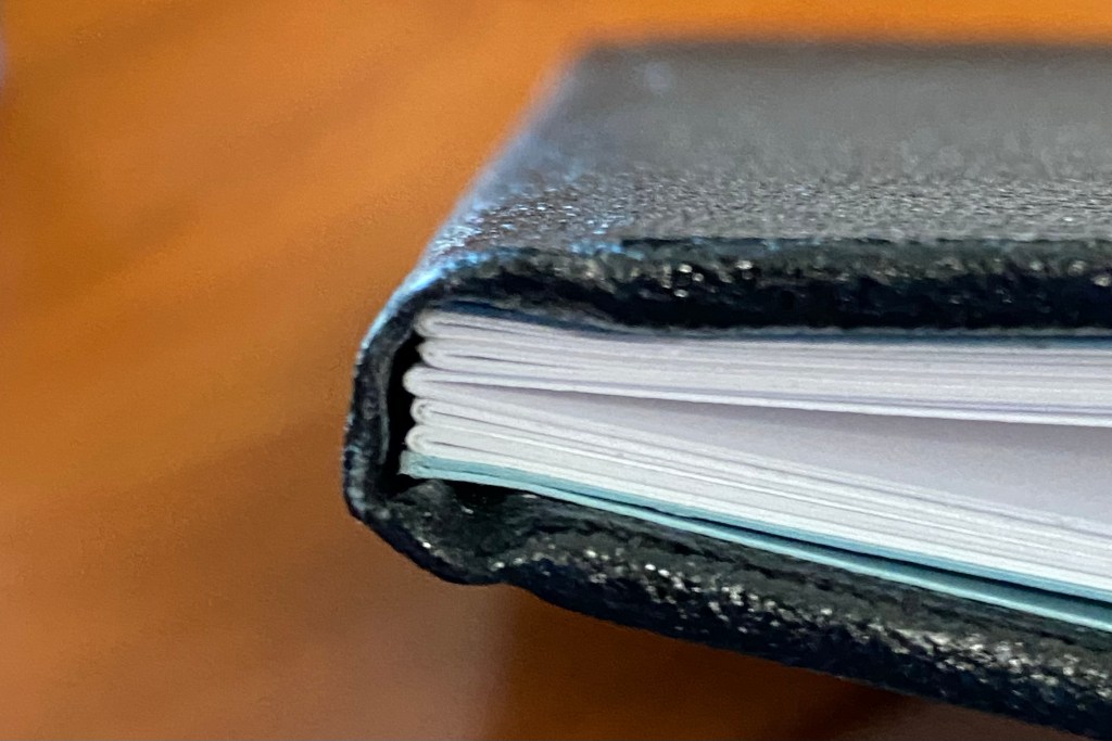 Traditionally-bound books are comprised of multiple multi-page booklets. Each booklet is a “signature” and all of the signatures are sown together and reinforced with cloth materials and flexible glue.