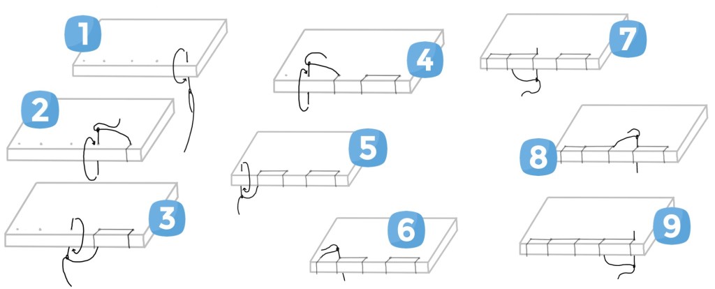 - Thread the needle with a length 3x the height of the book (approx. 18 inches).