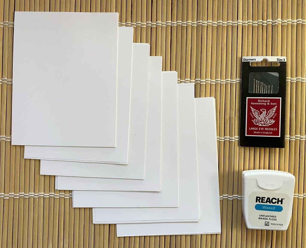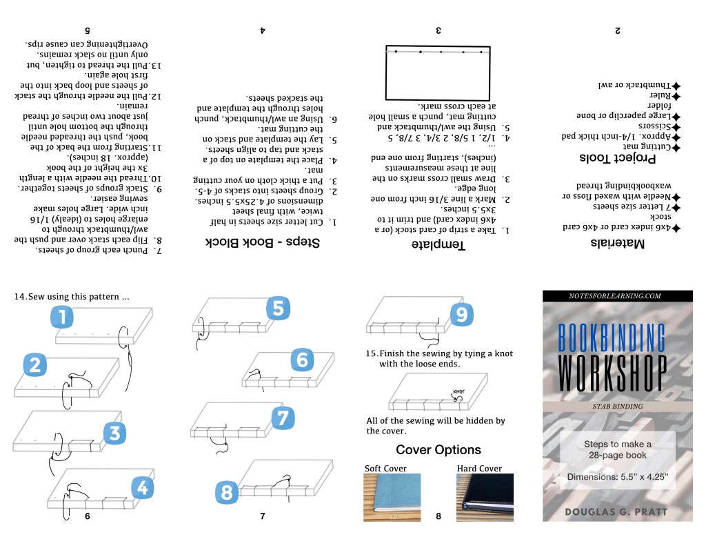 The instructions for this project will result in a small book (4.25 x 5.5) inches with 28 pages. This post covers the book block itself – the bound pages. I’ll share a simple flexible cover design and separately a more-involved hard cover design later.