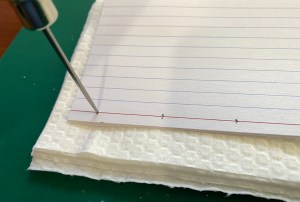 - While holding the stack, push the awl or thumbtack through each hole. Larger holes (approx. 1/16 inch) makes sewing easier.