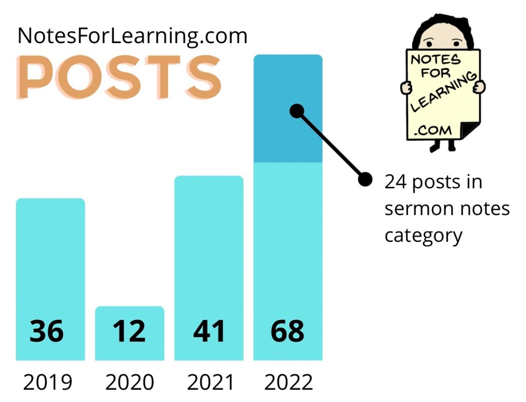 Like 2021, my goal in 2022 was to post weekly 4 times per month. I came fairly close this year using my regular posting schedule. In addition to regular posts, I also added a new category – sermon notes – for a total of 68 posts in 2022.