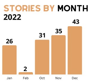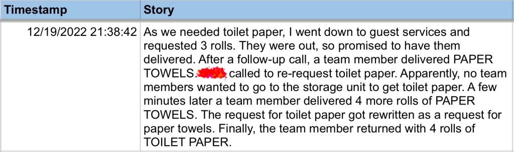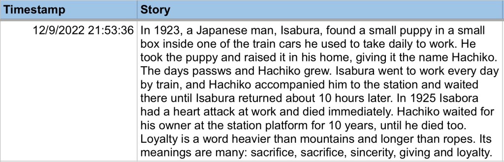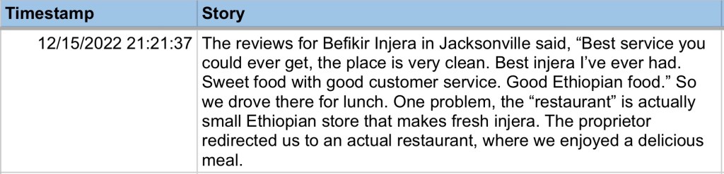 For reasons I can’t recall, I stopped entering stories after about a month. I tried and failed again in 2020. Keeping the stories in a notebook worked well, but makes it hard to search and connect stories. For that reason, in 2022 I returned to collecting stories in a spreadsheet, but only in January and the last quarter of the year.