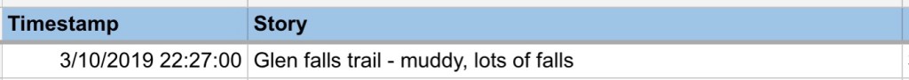 Using Google Forms, I created a simple form with the date of the story and the story. I connected the form to a Google Sheets spreadsheet where I also added a year field. The date and time of each entry are recorded by the form.