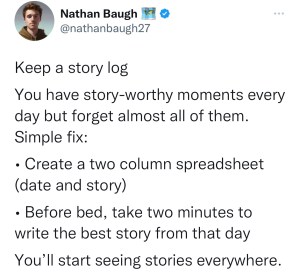 In Storyworthy, Matthew Dicks wrote about his experience noting daily at least one incident that occurred. The prompt he suggested is, “If I had to tell a story about today, what would it be?”