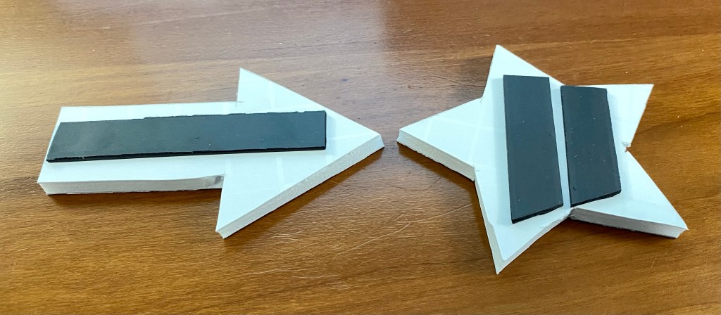 Add magnets if desired. For any pieces I wanted to use on the whiteboard, I cut with scissors appropriate length pieces of self-adhesive strip magnet and attached the strips to the backsides of the foam board pieces.