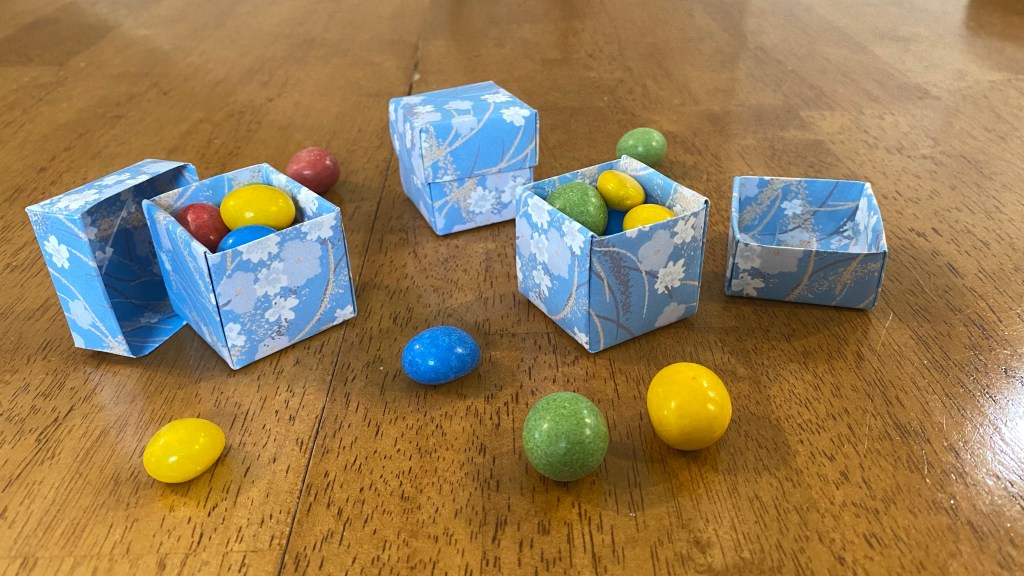 For the video, I used 6” x 6” paper for the base and 4 3/8” x 4 3/8” paper for the lid (which is the traditional masu box).
