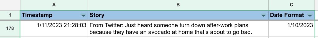 Google automatically sends the entry to a Google Sheets spreadsheet, on a worksheet titled “Form Responses 1.” Below is an entry from 1/10/2023. You can see that the “Timestamp” is different than the “Date Format” because sometimes I don’t enter a story until the next day.