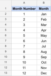 MONTH NAMES. Cells B21 to B32 reach out to the lookup worksheet discussed above. Logic: Look at each month number and find the corresponding month name.