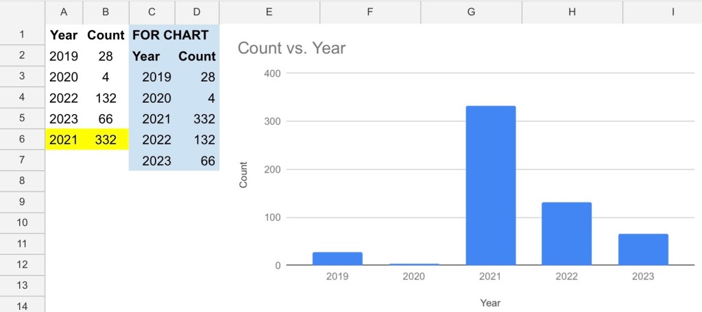 As noted above, my entries for 2021 are contained in a small notebook and are not included in the Form Responses data. Cells A2 to B5 are calculated from formulas, and I added Cells A6 and B6 manually. For the chart, I rearranged the data (C3 to D7) so that 2021 is correctly displayed in sequence with the other years on the chart.