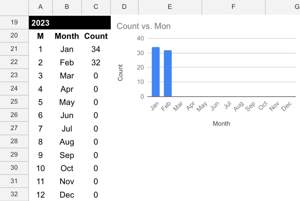 CURRENT YEAR. The year value in Cell A19 is used in Cells C21 to C32 for counting the number of stories. On 2/28/2023 (the date of this post), the value returned is 2023. The year will automatically update when we reach 2024 and reset the month-by-month counts.