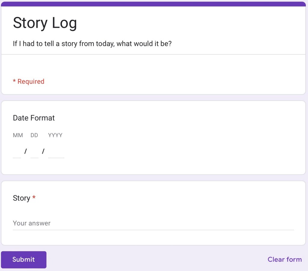 In January I shared a post on using a story log to build my own collection of personal stories. I created a Google Form to enter the date when I entered the story and the story.