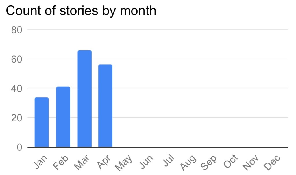 I covered my formulas for the story log in 2 of the biztools posts. As a result, I’m happy to share 1 chart that shows my monthly progress. My goal is 1 story per day. I exceeded the goal, for a total of 141 in the first quarter.