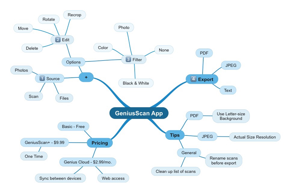 Below is a mind map I created of basic Genius Scan features. The number sequence indicates the order to create (1), edit (2), and filter (3) a scan. The final step is to export (4) the scan, either as a PDF or jpeg (I use Google Keep for conversion to text).