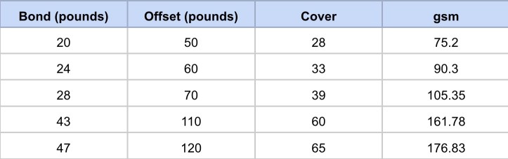 While researching for this post I learned for the first time how 20lb and 50lb can be equivalent. Bond paper weights are determined by weighing 500 sheets of full-size paper (17 x 22 inches), with the thickness as a factor. Five hundred full-size sheets of standard copy paper weigh 20 pounds. Offset paper uses dimensions of 25 x 38 inches as a full-size sheet. As a result, 500 full-size sheets of standard copy using offset specifications would weigh 50 pounds.