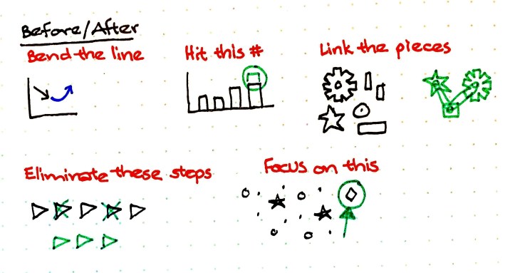 Instead of bringing prepared drawings, commit the drawing “to memory and practice drawing it a few times while narrating your thoughts. … Draw the picture from memory, explaining as you go. This is pure magic, and forms a sales bond unlike anything else.” P123