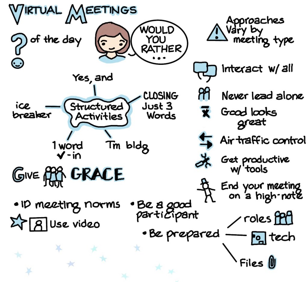 - Give attendees grace and be patient as they join virtual meetings and interact using available tools (raising hands, reacting with emojis, chatting, etc.).