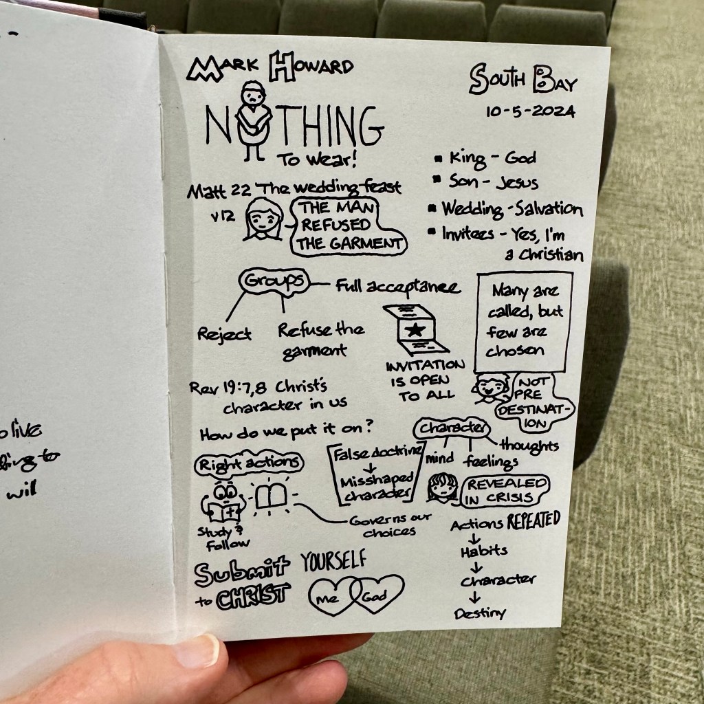 For my sermon notes, I only use the right side of the page. It makes a huge difference since I’m left-handed. You’ll notice a few words on the left-hand page. I use these pages for observations about the speaker, side notes from the sermon, and drawing practice, when I need it.