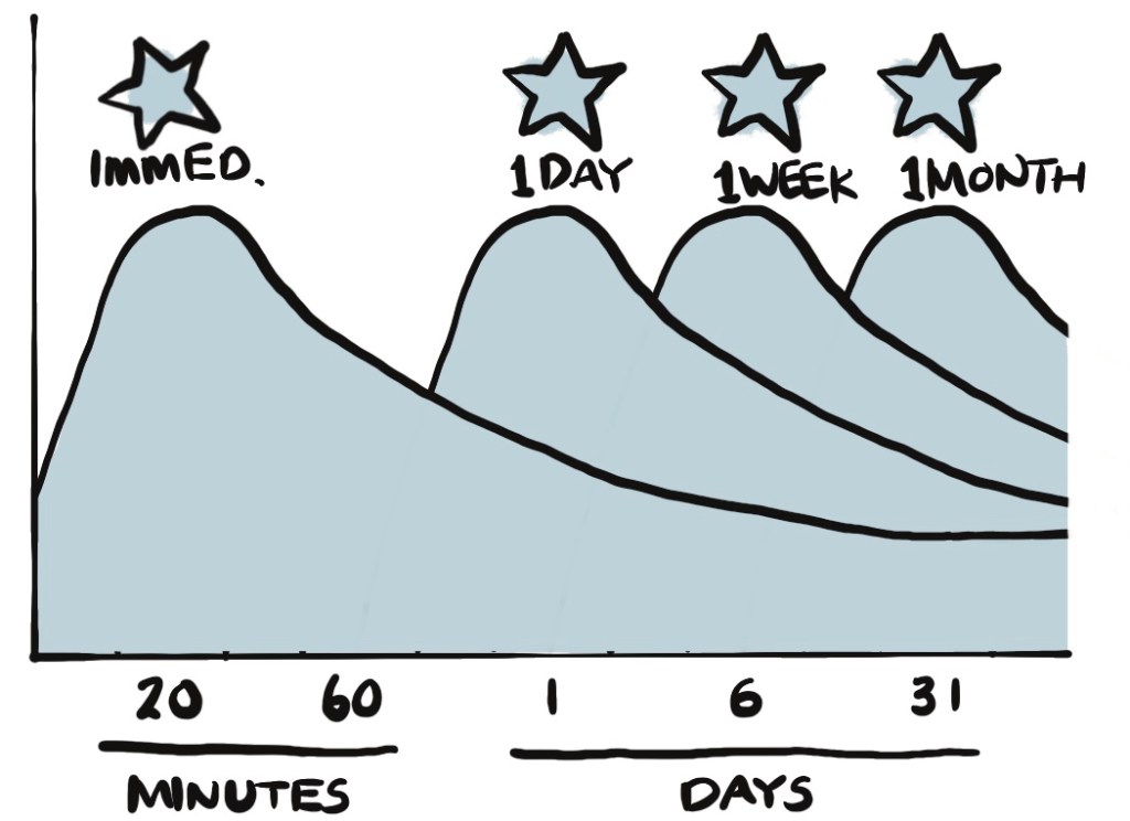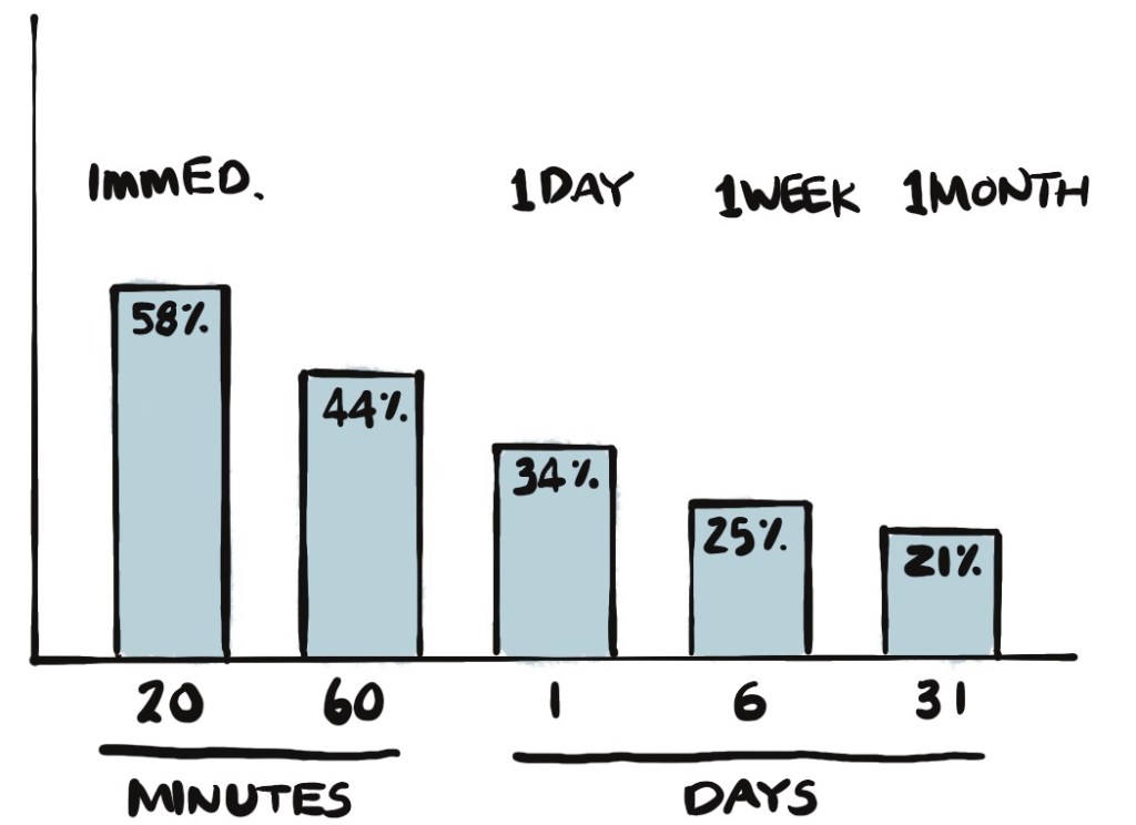 Ebbinghaus probably couldn’t imagine his name would be forever enshrined in the study of psychology as the “Ebbinghaus Curve” or the “forgetting curve.” As the chart below shows, the information we can recall drops precipitously even after just a few minutes. We tend to forget content quickly.