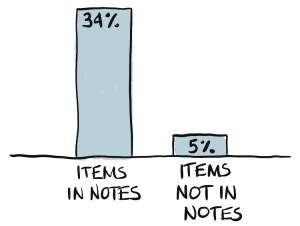 Adult students took notes after listening to paragraphs of inform-ation. Students had a 34% chance of recall for items they captured in their notes. For items not captured, the chance of recall was less than 5%.