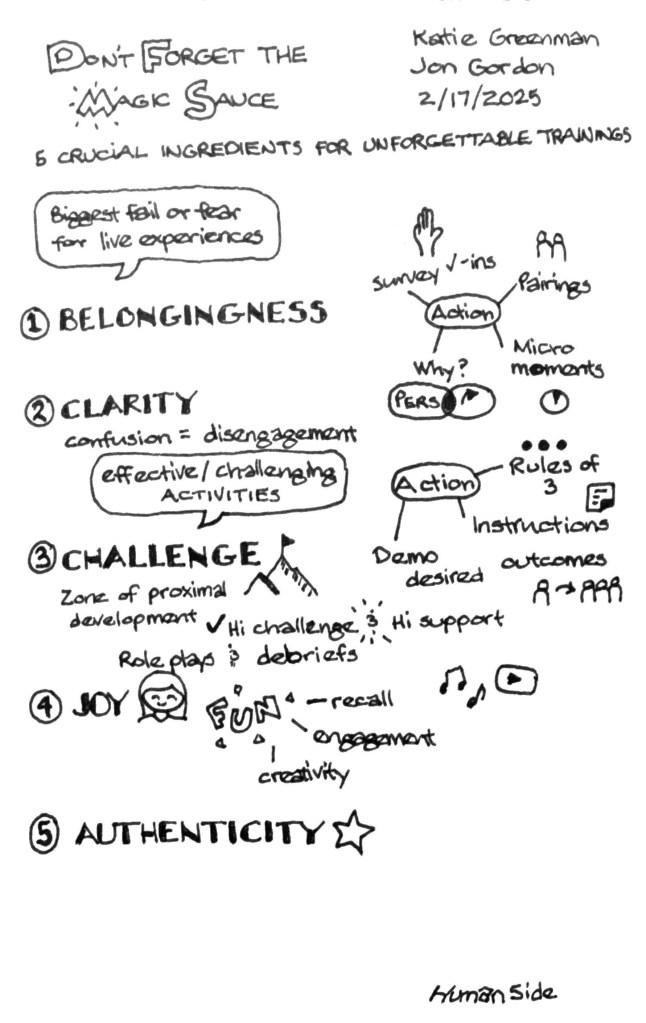 In this session from Training Conference 2025, Katie and Jon, the presenters, from HumanSide shared five crucial ingredients for unforgettable trainings.