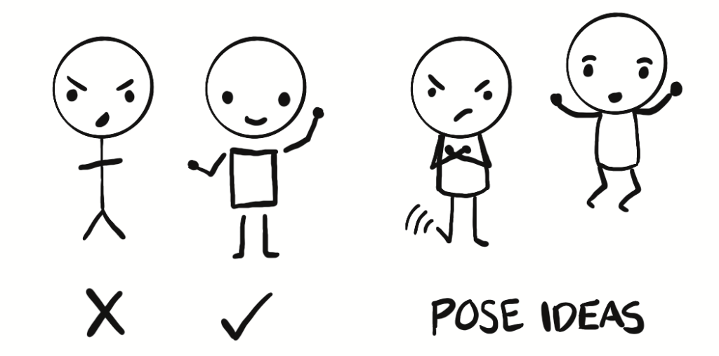 The human body consists of a head, torso, and limbs. Draw a circle for the head, a square for the body, and thin lines for limbs. Avoid stick figures. It is easy to draw more dynamic characters when they have bodies.