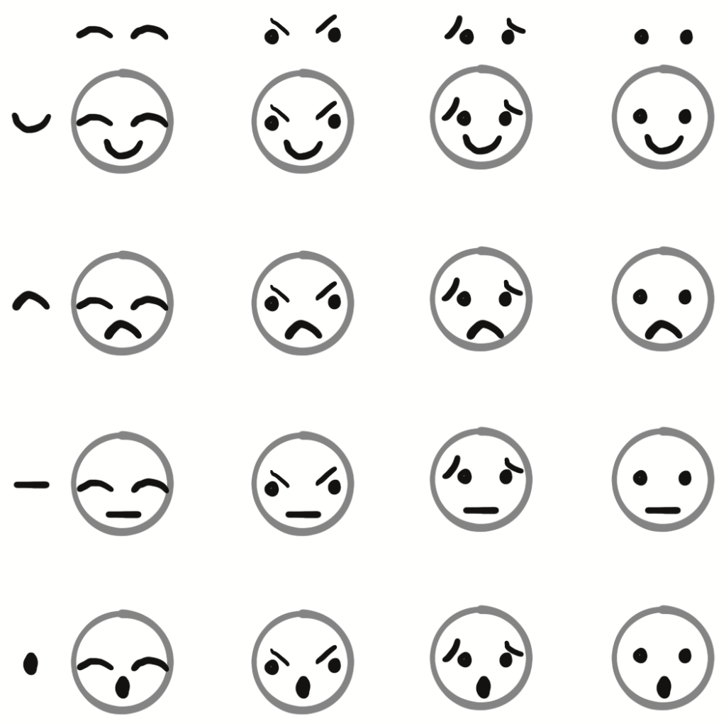For the emotions grid below, each row has the same mouth, and each column has the same eyes. Each mouth/eyes combination creates a different emotion.