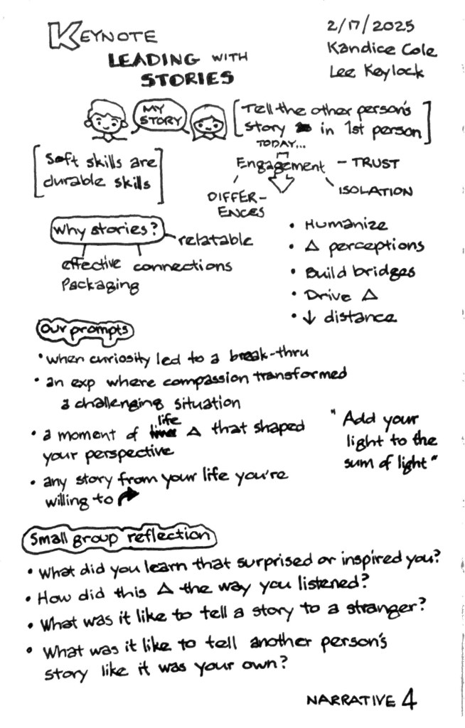 One of the keynote sessions from the Training 2025 conference I attended in February was titled, “Leading with Stories,” presented by Kandice Cole and Lee Keylock. Their company works with groups to tell stories, which results in better relationship connections.